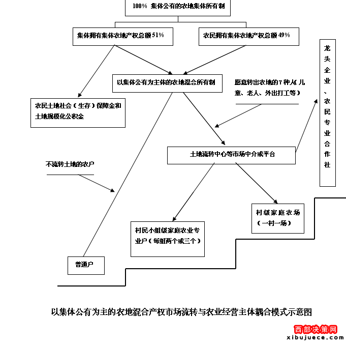 李錄堂向《西部大開(kāi)發(fā)》介紹,董家?guī)X村示范項(xiàng)目探索建立“以土地集體公有為主,非集體(農(nóng)民)土地所有為輔”的土地集體公有制,通過(guò)土地承包經(jīng)營(yíng)控制權(quán)比例化市場(chǎng)流轉(zhuǎn)試驗(yàn),組建土地股份合作社、家庭農(nóng)場(chǎng)和專(zhuān)業(yè)大戶(hù)等經(jīng)營(yíng)主體,實(shí)行規(guī)?;s化經(jīng)營(yíng),進(jìn)而科學(xué)地解決人多地少條件下土地產(chǎn)權(quán)市場(chǎng)化可能產(chǎn)生的社會(huì)不穩(wěn)定因素以及農(nóng)民農(nóng)地產(chǎn)權(quán)自由進(jìn)入和退出問(wèn)題,讓農(nóng)民“退出土地”有保障,“進(jìn)入土地”有支持,徹底消除農(nóng)民流轉(zhuǎn)土地的后顧之憂(yōu),形成“以公有制為主體具有雙重保障的農(nóng)地市場(chǎng)流轉(zhuǎn)機(jī)制”。這一農(nóng)村土地改革的新思路是遵照“以公有制為主體,多種所有制經(jīng)濟(jì)成分并存”的《憲法》原則,借鑒國(guó)有企業(yè)劃分國(guó)有股、企業(yè)股和企業(yè)全員持股的經(jīng)驗(yàn)及城鎮(zhèn)住房公積金改革的做法,將農(nóng)地產(chǎn)權(quán)(農(nóng)地承包經(jīng)營(yíng)使用權(quán)等)在集體和農(nóng)民之間按集體占51%,農(nóng)民占49%的比例混合分配后再市場(chǎng)化流轉(zhuǎn)。其中集體所占農(nóng)地產(chǎn)權(quán)及收益總額的51%主要用于農(nóng)民土地社會(huì)保障金和農(nóng)地規(guī)?;e金,以解決農(nóng)地市場(chǎng)流轉(zhuǎn)過(guò)程中失地失業(yè)農(nóng)民的生存和就業(yè)保障問(wèn)題,其余49%的收益歸農(nóng)民個(gè)人所有,進(jìn)而形成既能保證農(nóng)地集體所有制主導(dǎo)地位,又具有雙重保障和穩(wěn)定性的農(nóng)地產(chǎn)權(quán)市場(chǎng)流轉(zhuǎn)機(jī)制。