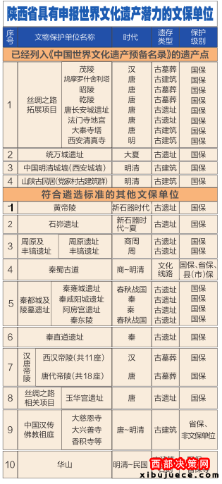 依據(jù)世界申遺遴選標準,結(jié)合陜西省遺產(chǎn)實際狀況與保護現(xiàn)狀,選定了兩大類文物點,第一類是已經(jīng)列入《中國世界文化遺產(chǎn)預(yù)備名單》的文化遺產(chǎn),共4處16個文物點;第二類是《陜西省申報世界文化遺產(chǎn)工作規(guī)劃》列入的擬申報遺產(chǎn)點,包括漢唐帝陵、石峁遺址、黃帝陵、周原及豐鎬遺址、秦蜀古道(蜀道)、秦都城及陵墓遺址、玉華宮遺址、秦直道遺址、中國漢傳佛教祖庭、華山等10處44個文物點。