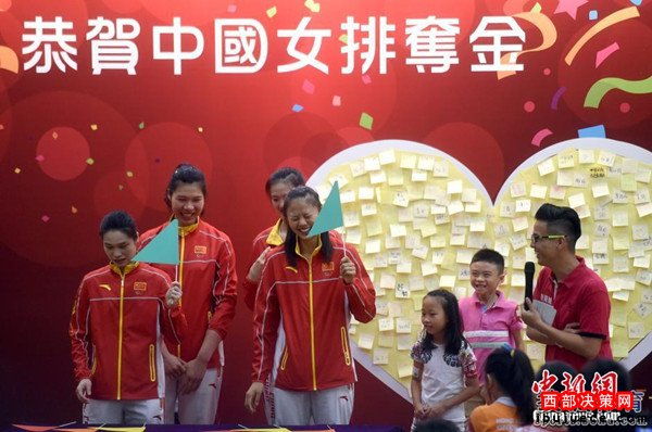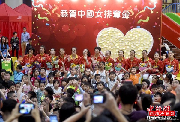 北京時(shí)間8月28日,女排隊(duì)員在香港與市民見面。見面會(huì)上女排姑娘與當(dāng)?shù)貎和M(jìn)行了互動(dòng)游戲,女排主教練郎平幽默扮鬼臉令人捧腹大笑。