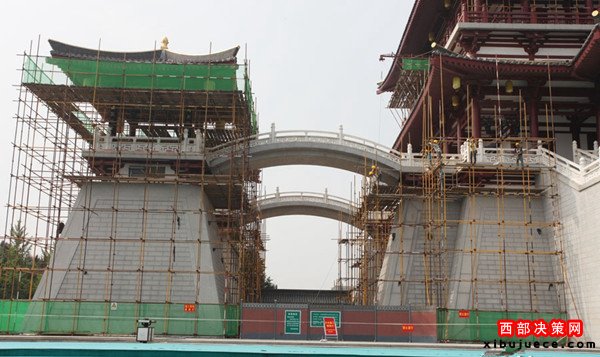 今年秋晚的舞美設(shè)計(jì)制作本著厲行節(jié)約的原則,對(duì)演播現(xiàn)場(chǎng)現(xiàn)有的實(shí)景建筑做了最大化的利用。晚會(huì)以中國(guó)目前最大的仿唐建筑群紫云樓為觀眾席背景,在廣場(chǎng)一側(cè)的人工景觀湖上搭建舞臺(tái)。舞臺(tái)主體通過(guò)一幅展開(kāi)的中國(guó)傳統(tǒng)畫(huà)軸形象,將西安城墻和大明宮角樓等元素有機(jī)地結(jié)合到一起,實(shí)現(xiàn)臺(tái)在水上、水在臺(tái)中的夢(mèng)幻效果,營(yíng)造出一種穿越千年、貫通古今的浪漫。