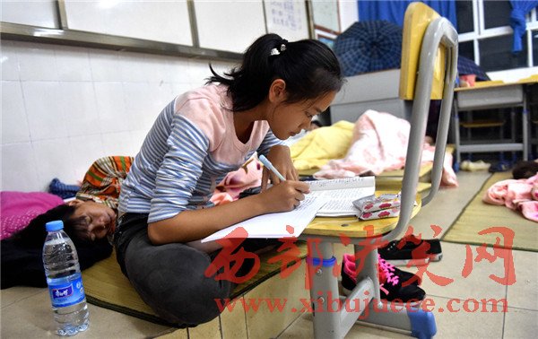 10月18日,在欽州市的臨時安置所內,高一學生廖凌在寫作業(yè)。