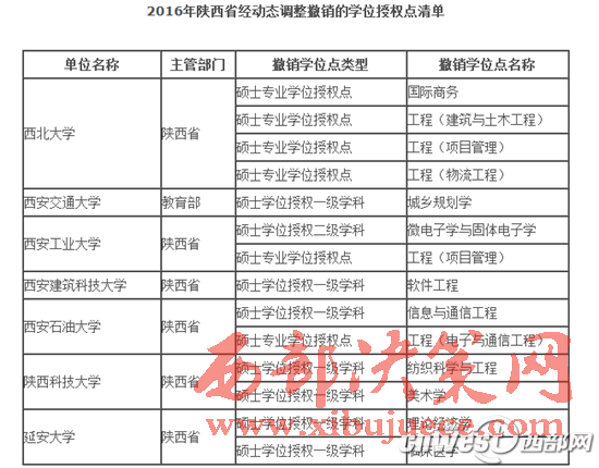 2016年陜西省經(jīng)動(dòng)態(tài)調(diào)整撤銷(xiāo)的學(xué)位授權(quán)點(diǎn)清單包括,西北大學(xué)的國(guó)際商務(wù)、西安交通大學(xué)的城鄉(xiāng)規(guī)劃學(xué)等7所大學(xué)的14個(gè)碩士專業(yè)學(xué)位授權(quán)點(diǎn)和碩士學(xué)位授權(quán)一級(jí)學(xué)科。