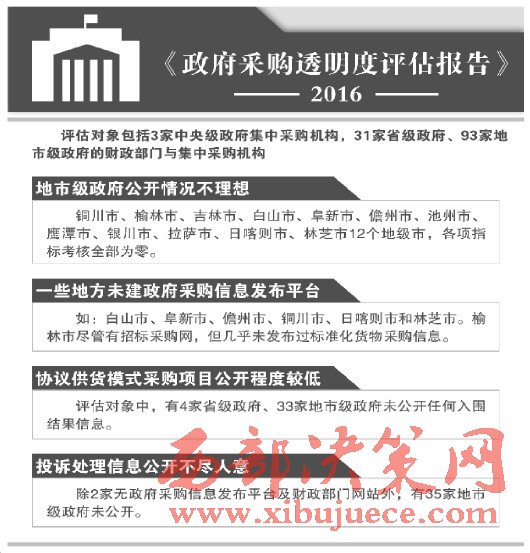 《報(bào)告》披露:我國政府采購信息公開情況仍不理想。主要表現(xiàn)為:地市級政府公開情況不佳。其中,陜西省銅川市、榆林市、吉林省吉林市、白山市、遼寧省阜新市、海南省儋州市、安徽省池州市、江西鷹潭市、寧夏銀川市以及西藏拉薩市、日喀則市和林芝市等12個(gè)地級市,在政府采購信息透明度各項(xiàng)指標(biāo)考核中全部為零分,在93家地市級政府成績排比中墊底。