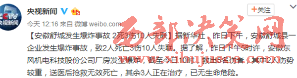 新聞中心官方微博今日消息稱,據(jù)新華社,昨日下午,安徽舒城縣一企業(yè)發(fā)生爆炸事故,致2人死亡3傷10人失聯(lián)。據(jù)了解,昨日下午5時(shí)許,安徽東風(fēng)機(jī)電科技股份公司廠房發(fā)生爆炸,截至今日10時(shí),救出5名傷者,其中2人傷勢(shì)較重,送醫(yī)后搶救無效死亡,其余3人正在治療,已無生命危險(xiǎn)。