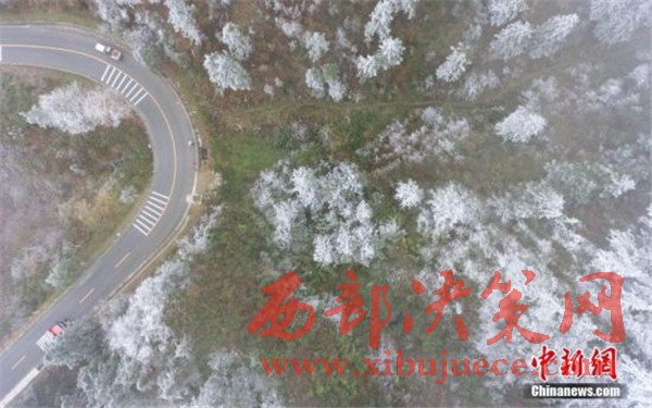 11月24日,航拍雷公山霧凇景觀。據(jù)貴州省氣象臺預(yù)報,受強冷空氣影響,貴州省大部地區(qū)降溫幅度都在8到16℃之間,部分地區(qū)出現(xiàn)雨夾雪。位于貴州省雷山縣的雷公山國家森林公園出現(xiàn)霧凇景觀,美不勝收。