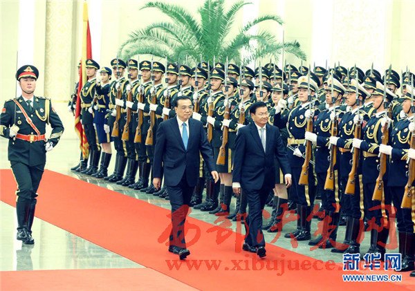 11月28日,國務院總理李克強在北京人民大會堂同來華進行正式訪問的老撾總理通倫舉行會談。這是會談前,李克強在人民大會堂北大廳為通倫舉行歡迎儀式。