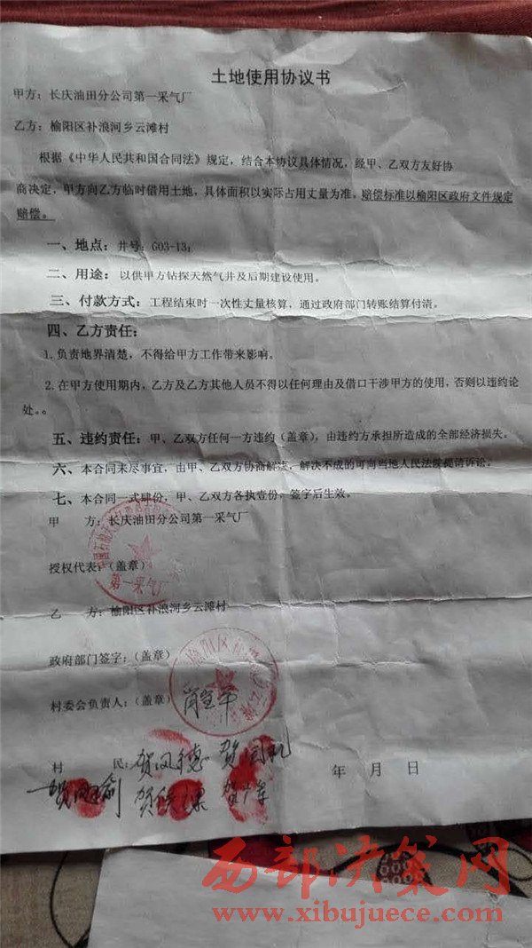 日前,陜西榆林榆陽(yáng)區(qū)補(bǔ)浪河一村民反映,長(zhǎng)慶油田采氣一廠在他們村征地鉆探天然氣井,村民懷疑長(zhǎng)慶采氣一廠和他們村委會(huì)簽定的《土地使用協(xié)議書(shū)》存在著嚴(yán)重的問(wèn)題。村民向記者看了一份所謂的巜土地使用協(xié)議書(shū)》,記者看到這份漏洞百出的協(xié)議書(shū),協(xié)議書(shū)的甲方是長(zhǎng)慶油田采氣一廠分公司,而協(xié)議書(shū)公章是中國(guó)石油天然氣長(zhǎng)慶股份有限公司(……)分公司,幾個(gè)關(guān)鍵的字根本看不清楚,不知道這個(gè)沒(méi)有蓋清楚公章的協(xié)議書(shū)到底想掩蓋什么?還是這枚公章就是一枚假公章。協(xié)議書(shū)的甲方名稱(chēng)為什么和公章名稱(chēng)不符呢?