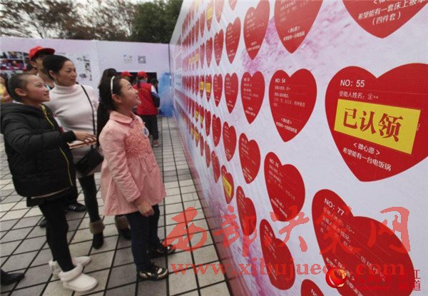 02-愛心墻前,市民和學(xué)生在看需要認(rèn)領(lǐng)的微心愿。