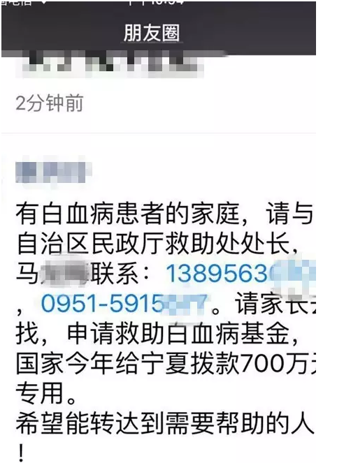 3日開始,該微信在多個朋友圈中刷屏,還公布了工作人員的手機,當天,多個網友撥打該手機申請或詢問是否能申請救助白血病基金。“剛開始還一頭霧水,后來看到了同事轉發(fā)給我的朋友圈截圖,才明白過來。”