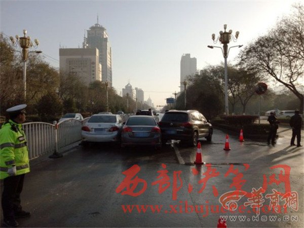 12月6日上午8時(shí)許,在渭南市區(qū)朝陽(yáng)大街與三賢路丁字以西,約300米長(zhǎng)的東向車道十分濕滑,共有16輛車接連發(fā)生交通事故