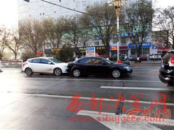 12月6日上午,在朝陽(yáng)大街與三賢路丁字,兩輛轎車因路面結(jié)冰發(fā)生追尾