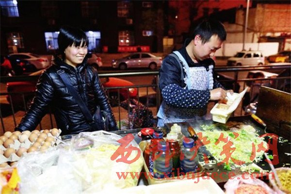 同樣是炒面,河南的楊氏夫婦賣(mài)的則是“鐵板炒”,在這個(gè)夜市攤干了近4年,每天倆人同出同進(jìn),朝夕相處,“有老婆在身邊,干活兒更有動(dòng)力,做生意也更和諧,更溫情。”