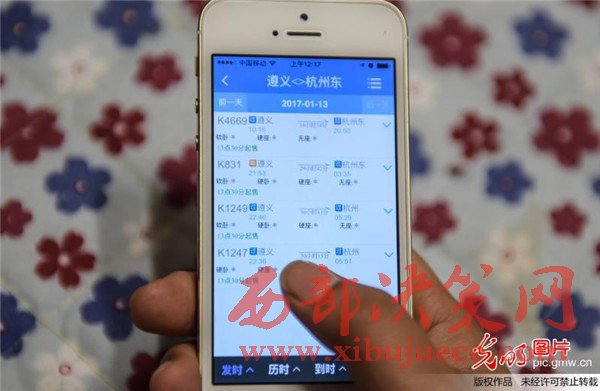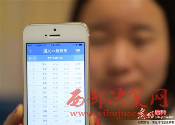2016年12月15日,一名貴州省余慶縣市民通過手機(jī)客戶端購買春運首日的車票。