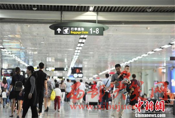 資料圖。圖為??诿捞m機(jī)場(chǎng)到達(dá)大廳迎來大量進(jìn)港旅客。