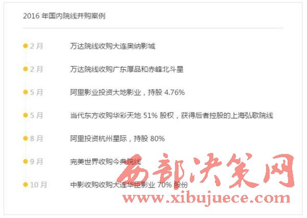 6年前,萬達院線伴隨著萬達商業(yè)地產(chǎn)的擴張不斷擴充自有院線。但隨著萬達的輕資產(chǎn)轉(zhuǎn)型和地域擴張的基本飽和,從去年始,萬達開始嘗試以并購的方式來擴大院線規(guī)模。2016年2月,萬達院線發(fā)布公告,宣布收購大連奧納,并將6家奧納影城一并納入麾下,同時收購了廣東厚品、赤峰北斗星兩家影投公司。8月24日,萬達院線與韓國CJ集團達成戰(zhàn)略合作,CGV影院將加盟萬達院線,同時雙方就映前廣告代理、4DX影院建設等事項開展合作。