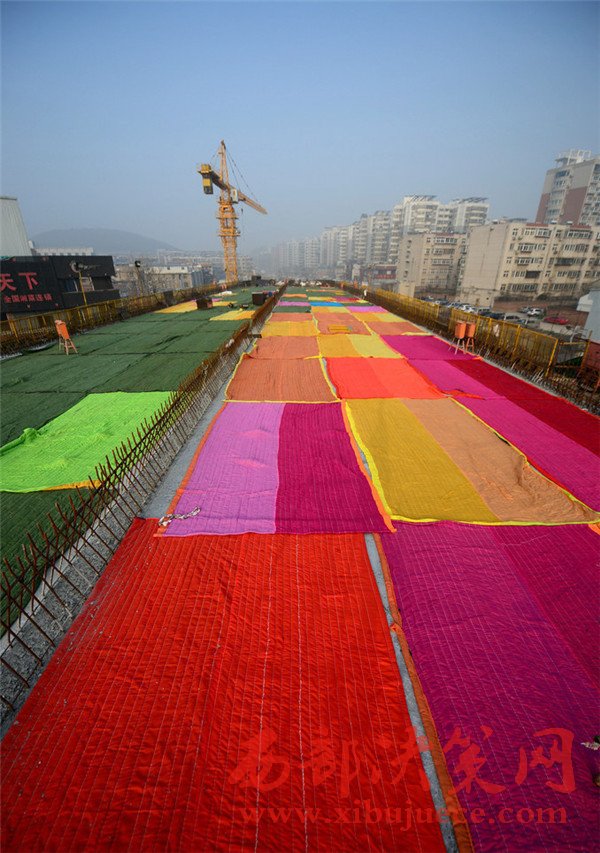 2017年1月2日,濟(jì)南,在七里山路附近的順河高架橋南延施工現(xiàn)場,百余米長的高架橋路面鋪設(shè)了彩色的棉被,總數(shù)達(dá)到100多條,覆蓋面積約2000多平方米 。據(jù)了解,該段高架橋?yàn)樾聺仓南淞?,為確保冬季低溫下混凝土能夠保證強(qiáng)度和防凍,施工采取多種保暖法,為路面蓋棉被取暖。