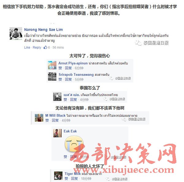 近日,據(jù)泰國網(wǎng)友稱,他的一位朋友因喝酒后頭暈,不慎跌入河道,由于不會(huì)水性,因此只能掙扎,并舉手向路人求救,而路人看見后立即沖上前,緩緩掏出手機(jī),開始各角度拍照,生怕自己錯(cuò)過了什么趣聞,并發(fā)送至臉書平臺,同時(shí)貼文表示,一弱智掉水里了,多名網(wǎng)友還回應(yīng)道:“他怎么掉下去的?哈哈哈。”
