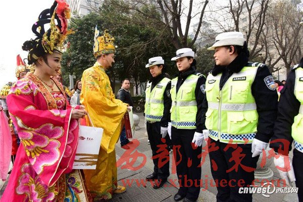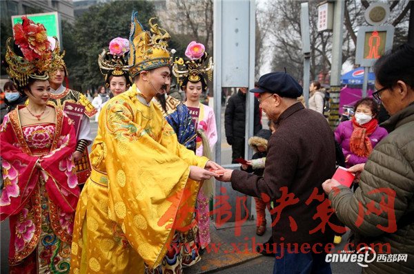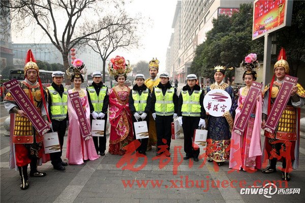 1月18日上午,來自華清宮的 “唐玄宗”與“楊貴妃”身著華麗唐服 “穿越”至西安街頭,為市民發(fā)放“來自唐朝的倡議書”和公交卡,并向交警和清潔工送上暖心禮物。