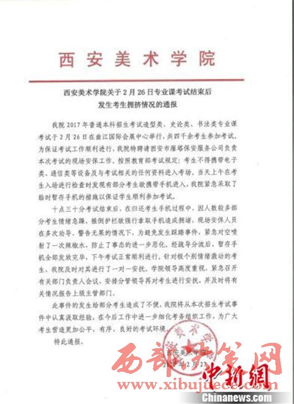 西安美術學院發(fā)布的事件通報稱,考試結束后,在歸還手機過程中,因人數(shù)較多部分考生情緒急躁,推倒護欄欲強行拿取手機造成擁堵,現(xiàn)場安保人員在多次勸導、警告無果的情況下,為避免發(fā)生踩踏時間,緊急對空噴射了一次辣椒水,防止了事態(tài)的進一步惡化。經(jīng)疏導分流后,暫存手機全部發(fā)放完畢,下午考試順利進行。針對個別情緒激動的考生,該院即使對其進行了一對一安撫。學院領導高度重視,緊急召開有關部門負責人會議,安排分管領導再對考生進行安撫,并及時將有關情況報告上級主管部門。此事件的發(fā)生給部分考生造成了不便,該院將從本次招生考試事件中認真汲取經(jīng)驗,在今后工作中進一步細化考務組織工作,為廣大考生營造更加公平、有序、良好的考試環(huán)境。