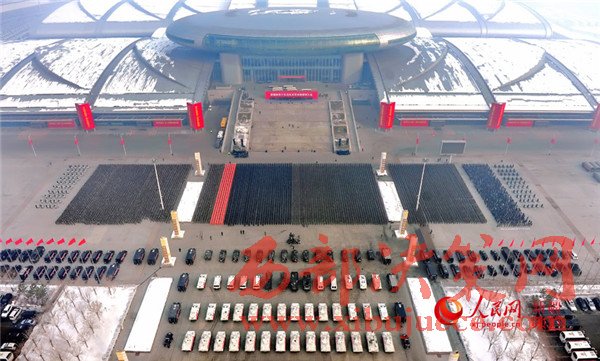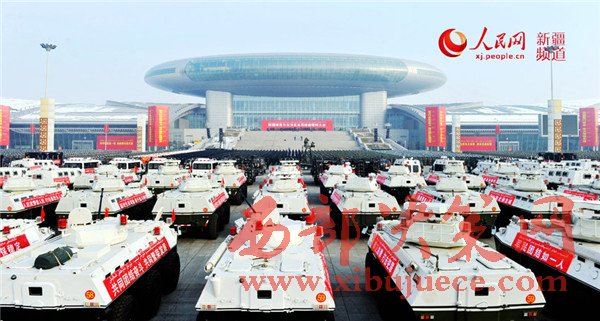 新疆國際會展中心廣場上,1萬余名武警官兵、公安民警、民兵預(yù)備役人員等各維穩(wěn)力量緊握鋼槍盾牌、整齊列隊挺立,直升機(jī)在空中盤旋,一輛輛軍車、裝甲車、摩托車列隊待發(fā)。