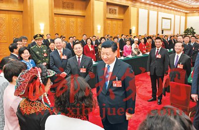 3月8日,中共中央總書記、國(guó)家主席、中央軍委主席習(xí)近平參加十二屆全國(guó)人大五次會(huì)議四川代表團(tuán)的審議。在“三八”國(guó)際勞動(dòng)?jì)D女節(jié)到來之際,習(xí)近平代表黨中央、國(guó)務(wù)院,向參加全國(guó)兩會(huì)的女代表、女委員、女工作人員,向全國(guó)各族各界婦女同胞,致以節(jié)日的祝賀和誠(chéng)摯的祝福。這是習(xí)近平同女代表親切交談。