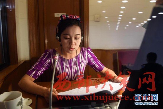 3月5日,民族語文翻譯組工作人員買熱巴·莫合買提在人民大會堂對十二屆全國人大五次會議開幕會進行同聲傳譯。