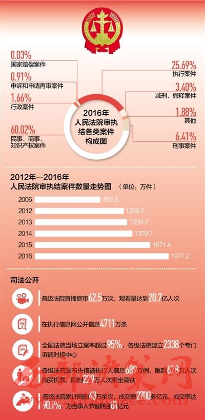 2016年,各級(jí)法院向執(zhí)行難全面宣戰(zhàn),共受理執(zhí)行案件614.9萬件,執(zhí)結(jié)507.9萬件,同比分別上升31.6%和33.1%,執(zhí)行到位金額1.5萬億元,同比上升54%。與公安部等10多個(gè)部門建立網(wǎng)絡(luò)執(zhí)行查控系統(tǒng),執(zhí)行法官足不出戶即可依法查詢被執(zhí)行人財(cái)產(chǎn)和相關(guān)信息,實(shí)現(xiàn)了執(zhí)行模式的根本變革。發(fā)布失信被執(zhí)行人信息689萬例,限制628萬人次購買機(jī)票,限制229萬人次乘坐高鐵。依法懲治拒不執(zhí)行裁判行為,司法拘留1.6萬人,追究刑事責(zé)任2167人,讓司法裁判真正成為懲治違法失信的利劍。