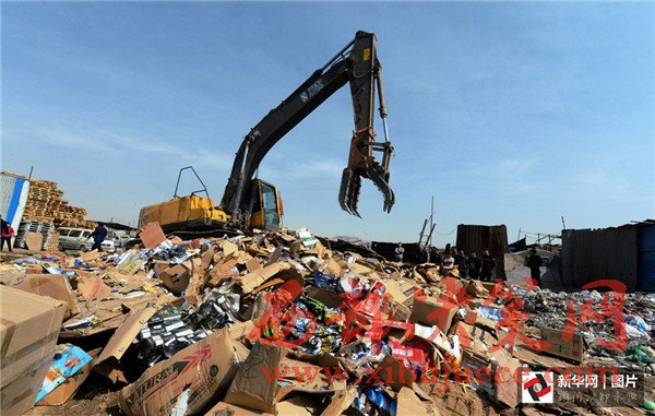 3月14日,在寧夏寧東垃圾填埋場,工作人員將假冒偽劣商品進(jìn)行填埋處理。“3·15”國際消費(fèi)者權(quán)益日即將到來之際,銀川市市場監(jiān)督管理局集中展示并銷毀食品、藥品、電器等32個(gè)類別的假冒偽劣商品。