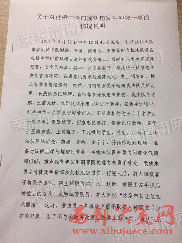 當(dāng)晚6點(diǎn)以后,涉事執(zhí)法隊(duì)員所屬執(zhí)法大隊(duì)杜橋執(zhí)法大隊(duì)書面回復(fù)便在網(wǎng)絡(luò)中被網(wǎng)友們不斷的轉(zhuǎn)載。據(jù)該回復(fù)稱:2017年3月22日中午12時40分左右,杜橋執(zhí)法大隊(duì)市容機(jī)動中隊(duì)謝鵬、朱勇、康忠民、王苗等4名執(zhí)法隊(duì)員在杜橋中學(xué)門前取締占道經(jīng)營飲食攤點(diǎn),當(dāng)時有八個攤點(diǎn)在此經(jīng)營,七個已勸離,其中一戶不愿離開,與執(zhí)法隊(duì)員康忠民發(fā)生言語沖突,在康忠民要求其搬離此處,禁止銷售時,攤點(diǎn)經(jīng)營者情緒激動,突然,用鋼管圓凳子砸向執(zhí)法隊(duì)員康忠民,致使康忠民胳膊、背部等多處軟組織損傷,執(zhí)法隊(duì)員謝鵬、王苗等見狀,立即趕到康忠民處進(jìn)行勸導(dǎo),在勸導(dǎo)過程中,杜橋中學(xué)一名學(xué)生說城管打人,不明真相的約五六十名學(xué)生一起起哄、謾罵城管,因康忠民被打,情緒比較激動,見學(xué)生歪曲事實(shí),上前推了一下起哄的學(xué)生,隨后,機(jī)動中隊(duì)執(zhí)法隊(duì)員朱勇、陳新亮、魏楠、徐嬌、姜寧寧、孫偉珍趕到現(xiàn)場,準(zhǔn)備對該攤點(diǎn)煤氣罐進(jìn)行暫扣,在執(zhí)法隊(duì)員朱勇關(guān)閉液化氣罐閥門時,攤點(diǎn)經(jīng)營者用鋼管圓凳砸向朱勇手臂處,致使朱勇左前臂及手背部多處軟組織損傷,打完人后,打人攤販妻子將凳子抓住,阻止攤販再次打人,這時,攤販用左手抓起攤位上的刀具,威脅城管隊(duì)員,并大聲說“這是市長讓他在此擺攤”,這時,旁邊另一名攤販上前奪取打人攤販左手所持的刀具;為了不與攤販再次發(fā)生肢體上的沖突,執(zhí)法隊(duì)員王苗撥打110報警,在警察到現(xiàn)場之前,攤販與執(zhí)法隊(duì)員一直僵持;警察趕到現(xiàn)場后,與商販進(jìn)行交涉,這時,商販亮出了精神病證,警察看后,把執(zhí)法隊(duì)員叫到一旁,告知執(zhí)法隊(duì)員此人有精神病;鑒于這種情況,執(zhí)法隊(duì)員依據(jù)法律法規(guī),將該攤點(diǎn)煤氣罐進(jìn)行暫扣,并將暫扣單交于打人商販的妻子,隨后,警察要求執(zhí)法隊(duì)員撤離現(xiàn)場,對當(dāng)事人進(jìn)行教育。