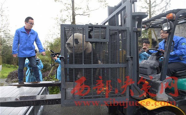 3月24日,工作人員在中國大熊貓保護(hù)研究中心都江堰基地隔離檢疫區(qū)準(zhǔn)備將大熊貓“寶寶”搬運(yùn)至盼盼園。