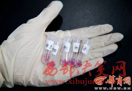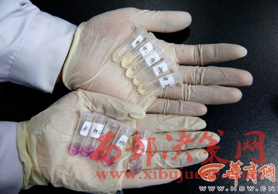 3.從1-5號浸泡液中取出200微升,滴在1.5ml的離心管里,滴加2滴硫酸鎂試劑1號(紫色),若顯色管中呈藍(lán)色,疑為摻硫酸鎂;
