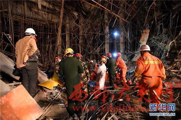 3月28日,救援人員在垮塌事故現(xiàn)場實施救援。