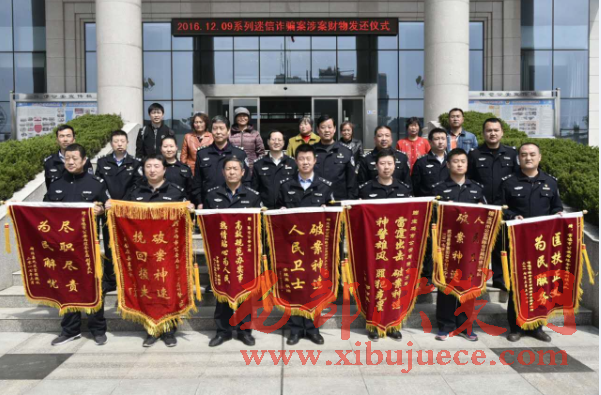 當(dāng)日,陳倉(cāng)公安分局現(xiàn)場(chǎng)向來(lái)自甘肅省會(huì)寧縣的受害群眾宋某芳和來(lái)自寶雞市千陽(yáng)縣的受害群眾邢某俠等7名群眾共計(jì)發(fā)放被騙贓款170000余元。當(dāng)宋某芳等7名群眾從該局局長(zhǎng)楊會(huì)軍和政委苗寶平手中領(lǐng)到被騙的現(xiàn)金時(shí)喜極而泣,不時(shí)的連聲說(shuō)“感謝公安局、感謝公安民警、真是謝謝啦”,有的群眾面向公安民警和媒體記者深深鞠躬表達(dá)謝意,并將七面繡著“人民衛(wèi)士、破案神速,為民服務(wù)、匡扶正義”等內(nèi)容的大紅錦旗增送到民警手中,表達(dá)心中的謝意。受害群眾被騙的款數(shù)從數(shù)千元到數(shù)萬(wàn)元不等,最高達(dá)50000余元。