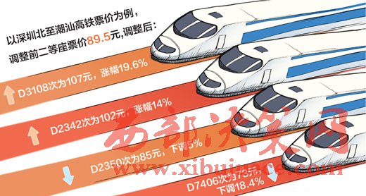 那么調(diào)價(jià)就是漲價(jià)嗎?其實(shí)并不是。工作人員介紹說(shuō),以深圳北至潮汕的高鐵票價(jià)為例,調(diào)整前二等座執(zhí)行票價(jià)為89.5元,調(diào)整后同樣區(qū)間,D3108次為107元,漲幅19.6%;D2342次為102元,漲幅14%;D2350次為85元,下調(diào)5%;D7406次為73元,下調(diào)18.4%。