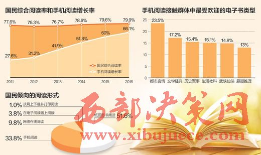 中國(guó)新聞出版研究院18日公布了第十四次全國(guó)國(guó)民閱讀調(diào)查的主要情況。調(diào)查顯示,2016年我國(guó)成年國(guó)民各媒介綜合閱讀率為79.9%,較2015年的79.6%略有提升,數(shù)字化閱讀方式的接觸率為68.2%,較2015年的64.0%上升了4.2個(gè)百分點(diǎn),圖書(shū)閱讀率為58.8%,較2015年的58.4%上升了0.4個(gè)百分點(diǎn)。2016年我國(guó)成年國(guó)民人均圖書(shū)閱讀量為7.86本,較2015年增加了0.02本。2016年手機(jī)閱讀率達(dá)到66.1%,已經(jīng)連續(xù)8年增長(zhǎng)。