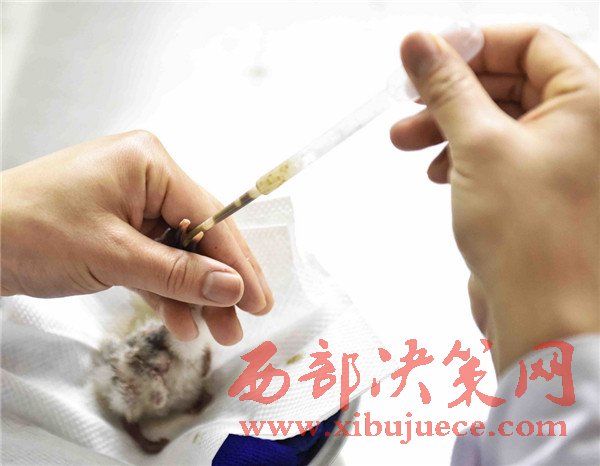 4月19日,工作人員在給朱鹮雛鳥喂食。