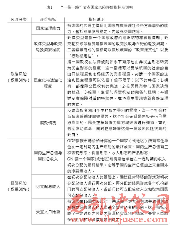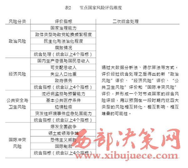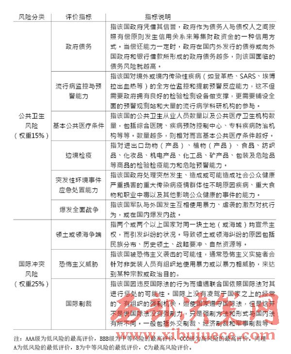 “一帶一路”建設中重要國家的治理風險是我們的主要關注對象,在借助國內(nèi)外智庫和科研院所已完成的眾多研究成果的基礎上,建立一套對節(jié)點國家風險的評級體系,如表1(見P28)所示。節(jié)點國家風險評價指標中,政治風險與經(jīng)濟風險的評價參考經(jīng)濟學人智庫的國家風險模型(EIU country risk model);公共衛(wèi)生風險的評價參考中國衛(wèi)生與經(jīng)濟社會發(fā)展統(tǒng)計數(shù)據(jù)庫對公共衛(wèi)生的指標設計;國際沖突風險評價根據(jù)經(jīng)濟學人智庫發(fā)布的白皮書《愿景與挑戰(zhàn)——“一帶一路”沿線國家風險評估》與中國出口信用保險公司發(fā)布的2015年版《國家風險分析報告》和《全球風險地圖》綜合考量得出。具體而言,我們可以從“政治風險”“經(jīng)濟風險”“公共衛(wèi)生風險”和“國際沖突風險”四個維度來評估選擇出的節(jié)點國家的風險,如表2(見P30)所示。