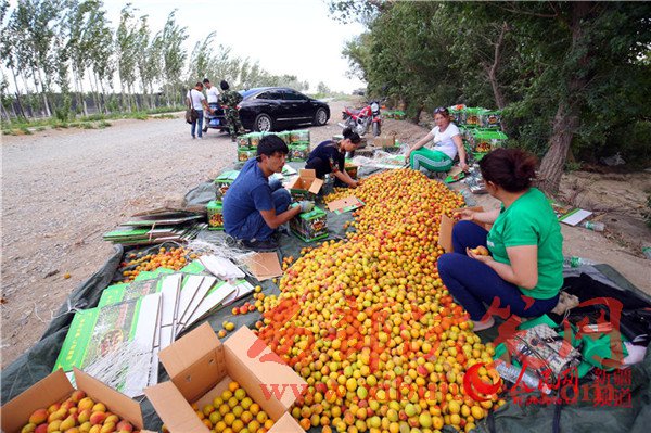 走進(jìn)周振峰的杏院子,紅彤彤的杏子已經(jīng)壓彎了枝頭,大家正在緊張采摘。在杏園外,從烏魯木齊來的客商買買提·吐爾遜也和自己的員工一起挑揀品質(zhì)較好的杏子進(jìn)行包裝。他告訴筆者,因?yàn)橥锌诉d的杏子每年都比其他地方成熟的要早,所以他每年都要來托克遜收購杏子,每年最少收購400噸。