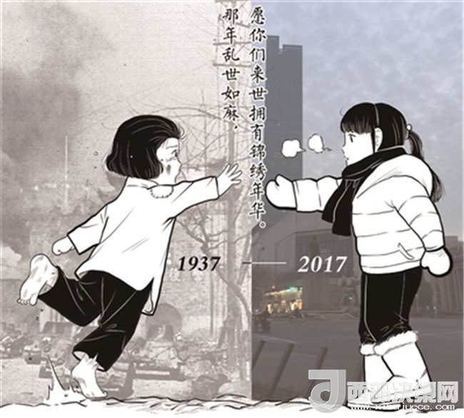 12月13日,南京大屠殺死難者國家公祭日,這一天,許多人的微博和朋友圈被一張圖片刷屏。在圖里,一名來自1937年的女孩和一名來自2017年的女孩隔空相對,彼此伸出手想要抓住對方。其中1937年里的女孩全身是灰,衣服單薄,光著雙腳,她的身旁是槍火留下的煙塵和戰(zhàn)爭留下的荒亂;而2017年里的女孩穿著暖和的棉服,在她身后,是現(xiàn)代的高樓和干凈的街道。兩人的中間寫有一行字,“那年亂世如麻,愿你們來世擁有錦繡年華”。