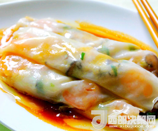 11.最后卷好,兩端切平整一點(diǎn)就可以裝盤。重復(fù)操作,很快就可以吃到自己做的鮮美腸粉了,醬料隨自己喜歡。