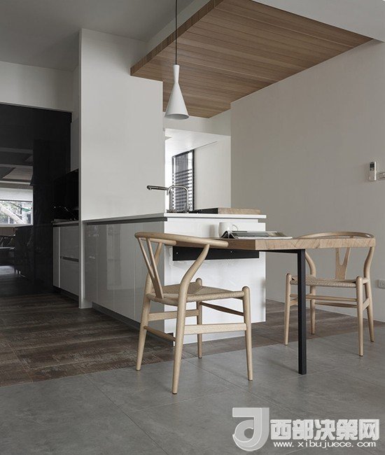 將洗手臺放在中間的位置,配上組合的簡易餐桌,不做吧臺的設(shè)計也能滿足開放式的需求,在家下廚較少的業(yè)主可以考慮。