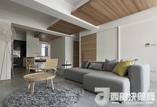 站在長廊一頭視線忍不住會跟著木質(zhì)頂板向前眺望,一直延伸至窗外,室外的采光經(jīng)過漫反射幾乎可以引入整個客廳。