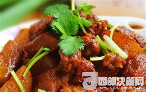5、蓋上蓋子,燉1個(gè)小時(shí),期間注意翻動(dòng)幾次,防止鍋底焦掉,加入蘿卜塊,繼續(xù)燉半小時(shí),如果湯還是很多,可以開大火燒,這樣湯汁收干的快一點(diǎn),最后撒點(diǎn)香菜,出鍋裝盤即可。