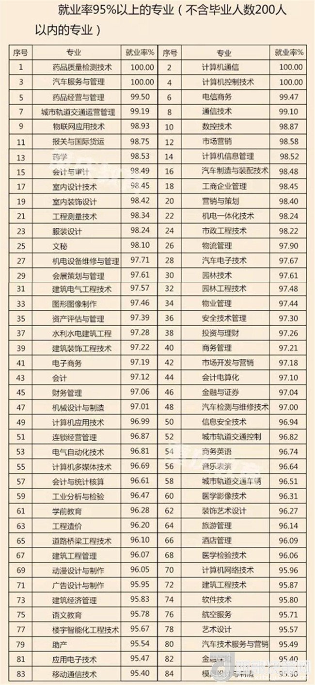 ??疲焊鲗I(yè)大類畢業(yè)生就業(yè)率均在92.00%以上 4個專業(yè)就業(yè)率達100%