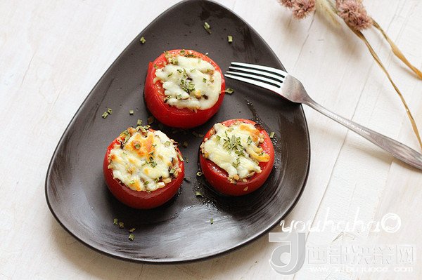 7、到時取出烤盤,西紅柿裝盤,撒少許的干蔥即可。