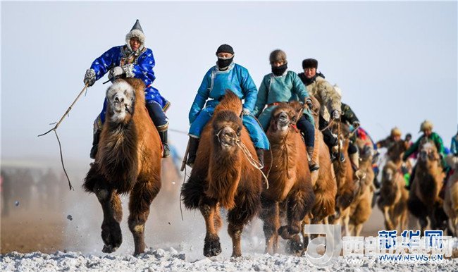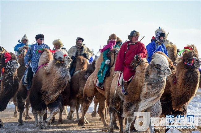1月16日,在內(nèi)蒙古錫林浩特鳳凰馬場,當(dāng)?shù)貫跆m牧騎的演員們騎著駱駝進入會場演出。