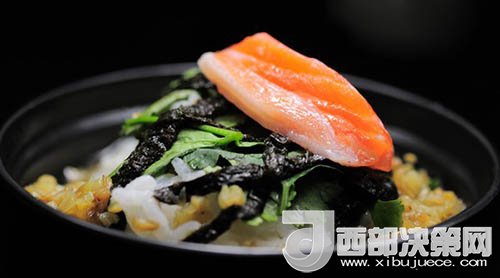 4、在碗中盛入米飯,加入三文魚、紫菜、蔥花、芝麻,并以適量芥末、醬油和鹽調味;