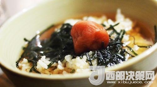 1 、將米飯盛到碗中,撒上鹽、醬油、熟芝麻、海苔絲最后擺上梅子