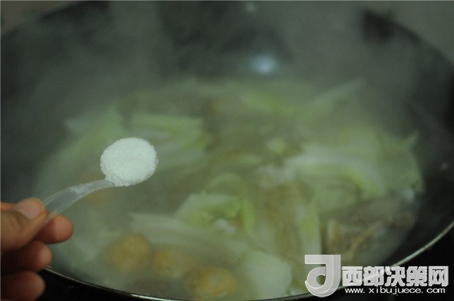 輔料:油 一勺  鹽 一撮  白菜葉 幾片  肉丸子 幾個  香菜 幾片