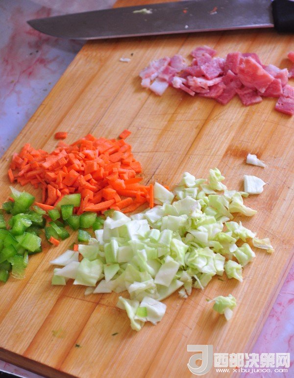 主料:胡蘿卜 10克 青椒 10克 培根 1片 雞蛋 50克 包菜 10克 面粉 40克